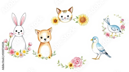 Adorable Watercolor Animals Flowers Bunny Cat Dog Birds Floral Wreaths Spring Cute Childish