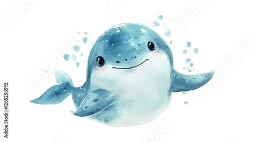 Adorable watercolor baby whale with a cute smile swimming in the ocean