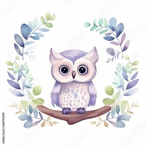 Adorable watercolor owl illustration perched on a branch surrounded by pastel leaves, perfect for whimsical decor or children's artwork.