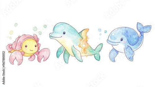 Adorable Watercolor Sea Creatures A Charming Illustration Featuring a Crab, Dolphin, and Whale, Perfect for Children's Books or Prints