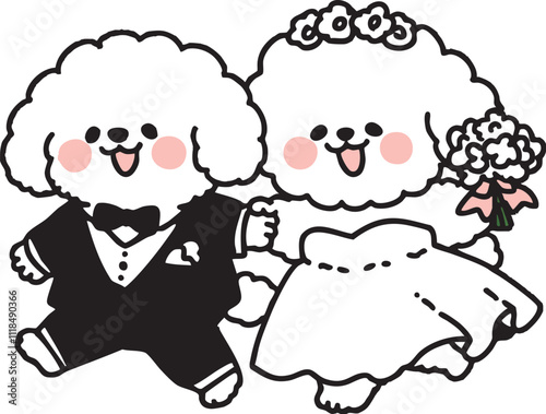Adorable Wedding Dogs in Tuxedo and Bridal Gown Holding Flowers