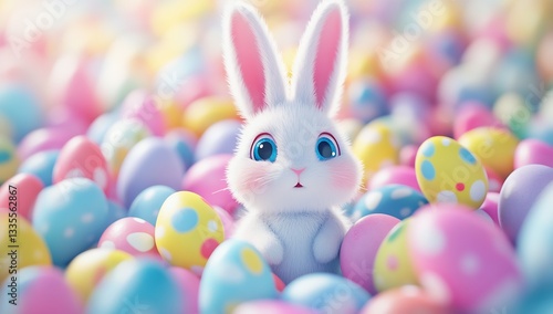 Adorable white bunny with big eyes surrounded by colorful Easter eggs in cheerful setting : Generative AI