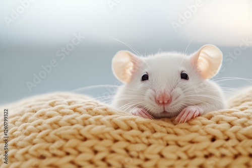 Adorable white mouse cuddling on a cozy knitted blanket