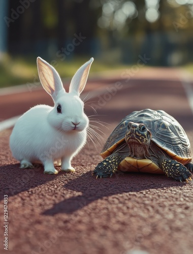 Adorable White Rabbit and a Tortoise on a Track at Golden Hour, Captivating Nature Scene Showcasing Different Animals and Their Unique Traits