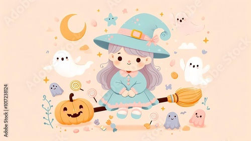 Adorable Witch Girl on Broomstick with Cute Ghosts and Pumpkin