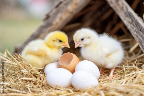 Adorable yellow and white chicks with eggs in straw nest outdoors