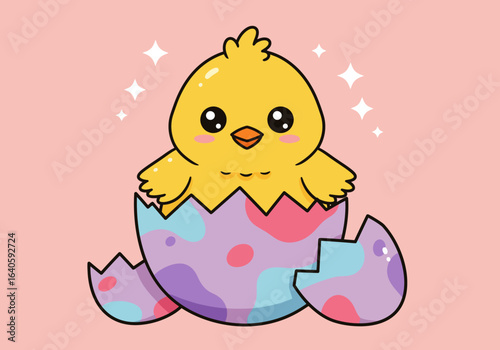 Adorable yellow baby chick emerging from a decorated Easter egg. A charming cartoon for spring and holiday greetings.