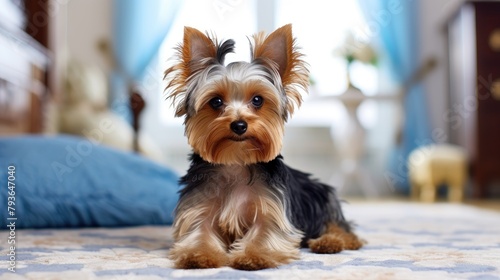 Adorable Yorkshire Terrier resting on a white carpet in the living room, Ai Generated.