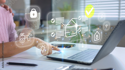 Adult Asian woman manages smart home system laptop computer security automation comfort efficiency modern digital residence environment