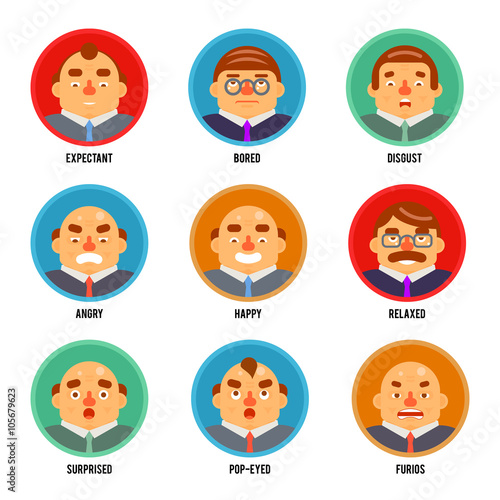 Adult Avatar Emotions Happy Surprised Mustache Angry Set Boss Character Symbol Business Icon Isolated White Background Concept Flat Design Template Vector Illustration
