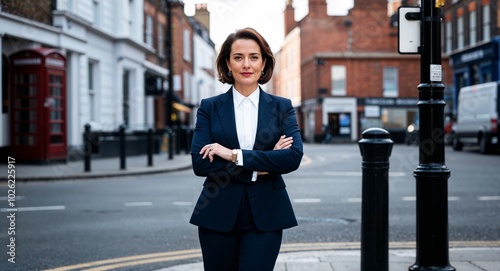 Adult British woman in formal attire confident pose portrait photo street corner background