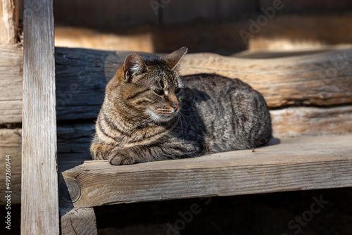 Adult cat sitting on a wooden ladder.
