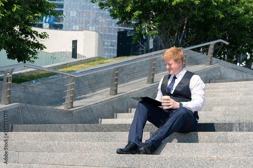 Adult caucasian man sits on the steps with documents and holds reusable coffe cup. The man is wearing a business uniform. Coffee break theme.