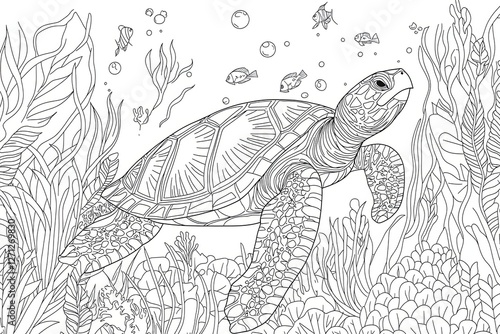 Adult colouring page with a turtle. Outline intricate underwater design.