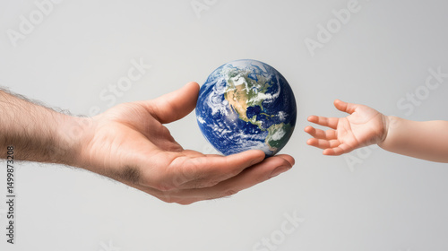 Adult hand gives baby hand the planet earth. Earth Day theme background wallpaper.