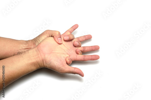 adult hands showing the example how to doing PCR with fore hand side to help the unconscious patient on white background isolated