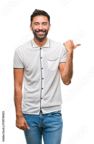 Adult hispanic man over isolated background smiling with happy face looking and pointing to the side with thumb up.