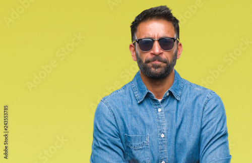 Adult hispanic man wearing sunglasses over isolated background skeptic and nervous, disapproving expression on face with crossed arms. Negative person.
