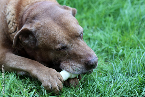 Adult Labrador dog playing with a bone on green grass. Natural organic snack for healthy pet.