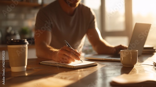 Adult Learner Engaged in Online Class with Notepad and Laptop