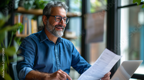 Adult male businessman reading business papers and smiling while sitting at his desk in the office.
