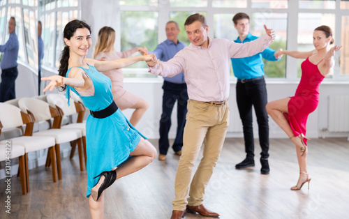 Adult man and young woman dancing in dance class