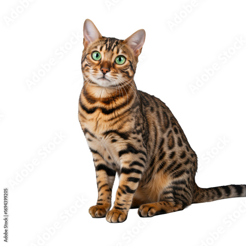 Adult purebred Bengal cat with rosetted tabby coat, emerald eyes, graceful pose, direct eye contact, catnip on clean transparent studio background. Concept for pet product advertising