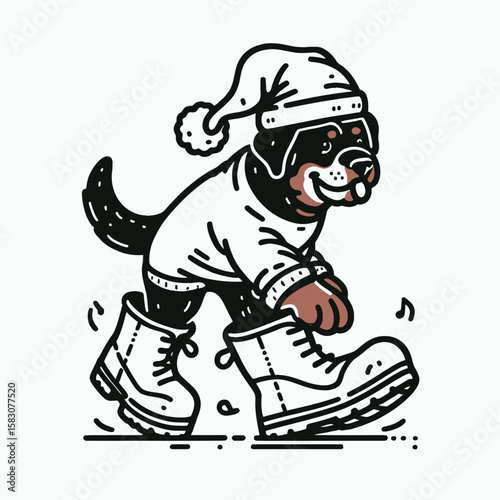 Adult Rottweiler Dog wear santa hat stumbling in oversized Christmas boots. Holiday Clipart Line Art Vector Illustration Xmas. .