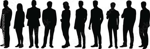 Adult silhouettes, standing poses, vector illustration, black figures, man, woman, professional attire, casual clothing, side view, front view, reference
