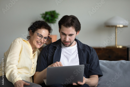Adult son teaching mature mom to use online virtual app, banking service on laptop. Senior mother and grown child sitting on couch together, holding computer, browsing internet, talking