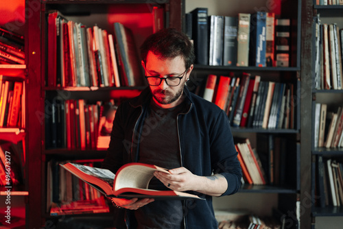 Adult student reading a book in the college library in a red light. Young male wearing glasses with bookshelves on background.