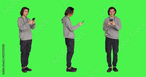 Adult texting messages on phone standing over greenscreen background, using social media app to chat remotely with friends. Asian joyful person messaging on modern smartphone.