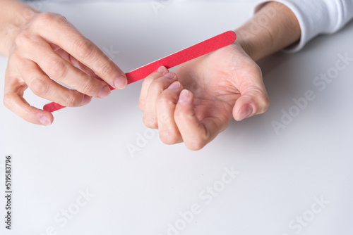 adult woman filing her nails, manicure, hand care, wrinkled hands