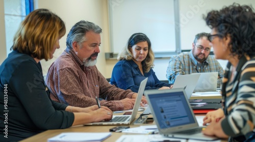 Adults working on a collaborative project in a community education center, using laptops and reference materials