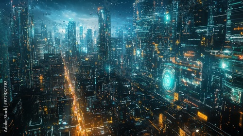 Advanced AI metropolis, digital integration, futuristic technology, holographic networks