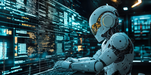 Advanced AI Robot Conducting Automated Market Analysis in a High-Tech Environment