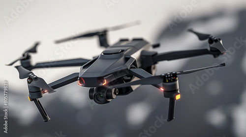 Advanced Black Quadcopter Drone Flying Against a Mountainous Backdrop at Dusk.