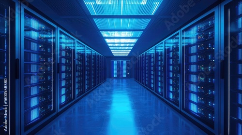Advanced blue-lit server room with grid ceiling and reflective floor, showcasing high-end data storage, cloud systems, cybersecurity infrastructure, and futuristic IT environments