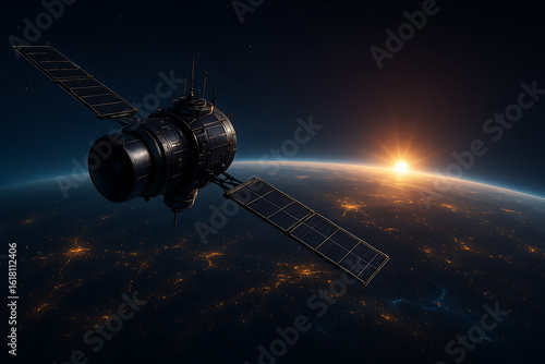 Advanced communication satellite gliding through space with glowing solar wings as sunrise illuminates earths horizon and scattered night lights across the dark planet
