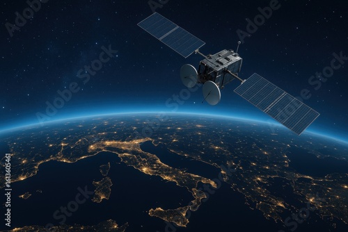 Advanced communication satellite orbiting Earth, illuminating continents at night, symbolizing global connectivity, space technology, and modern telecommunication networks