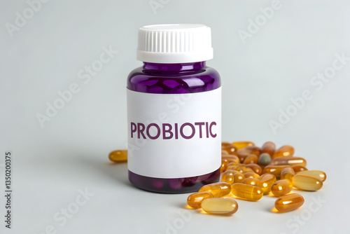 Advanced Probiotic Formula in Violet Container with Amber Pills, Gut Health Management
