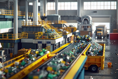 Advanced recycling plant with Industry 4.0 automation, emphasizing sustainability and worker safety. 3D, Printing, Illustrat, AI.