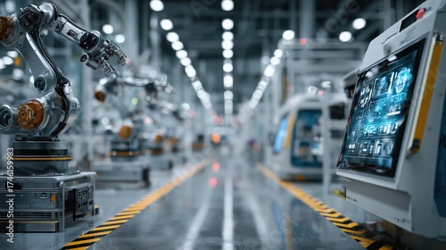 Advanced Robotics and Automation in a High-Tech Manufacturing Facility with Robots and Displays