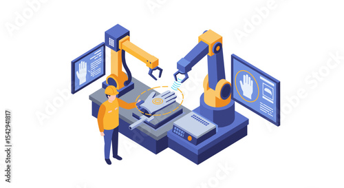 Advanced robotics in manufacturing process with automated assembly and precision technology vector illustration isometric