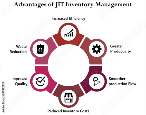 Advantages of JIT Inventory Management. Infographic template with icons and description placeholder