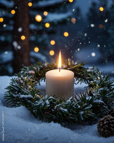 Advent wreath with the first lit candle and Christmas decoration outdoors