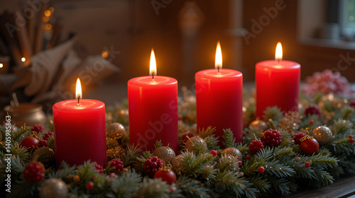 Adventskranz mit vier roten brennenden Kerzen, warm, candles