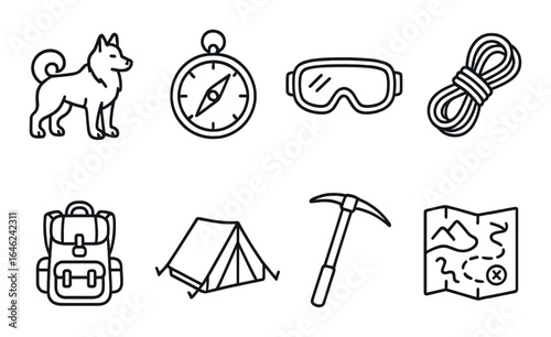 Adventure icons: dog, compass, goggles, rope, backpack, tent, ice axe, map