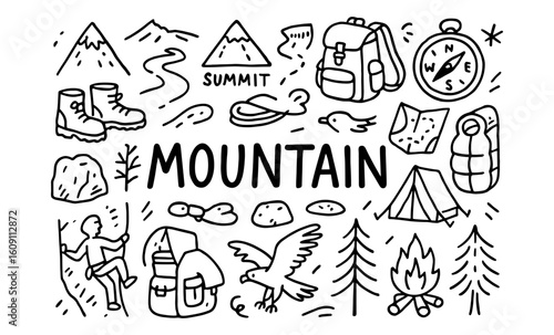 Adventure icons featuring hiking, camping, and nature elements in a hand-drawn style
