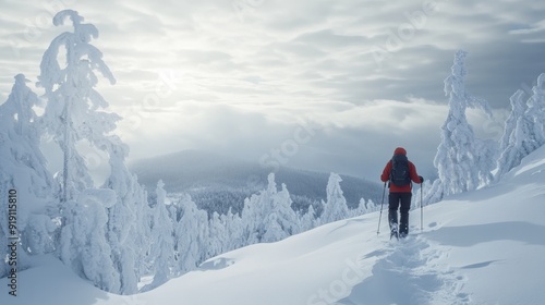 Adventurer ascending a snowy slope in a winter landscape with snow-covered trees and a cloudy sky in the background